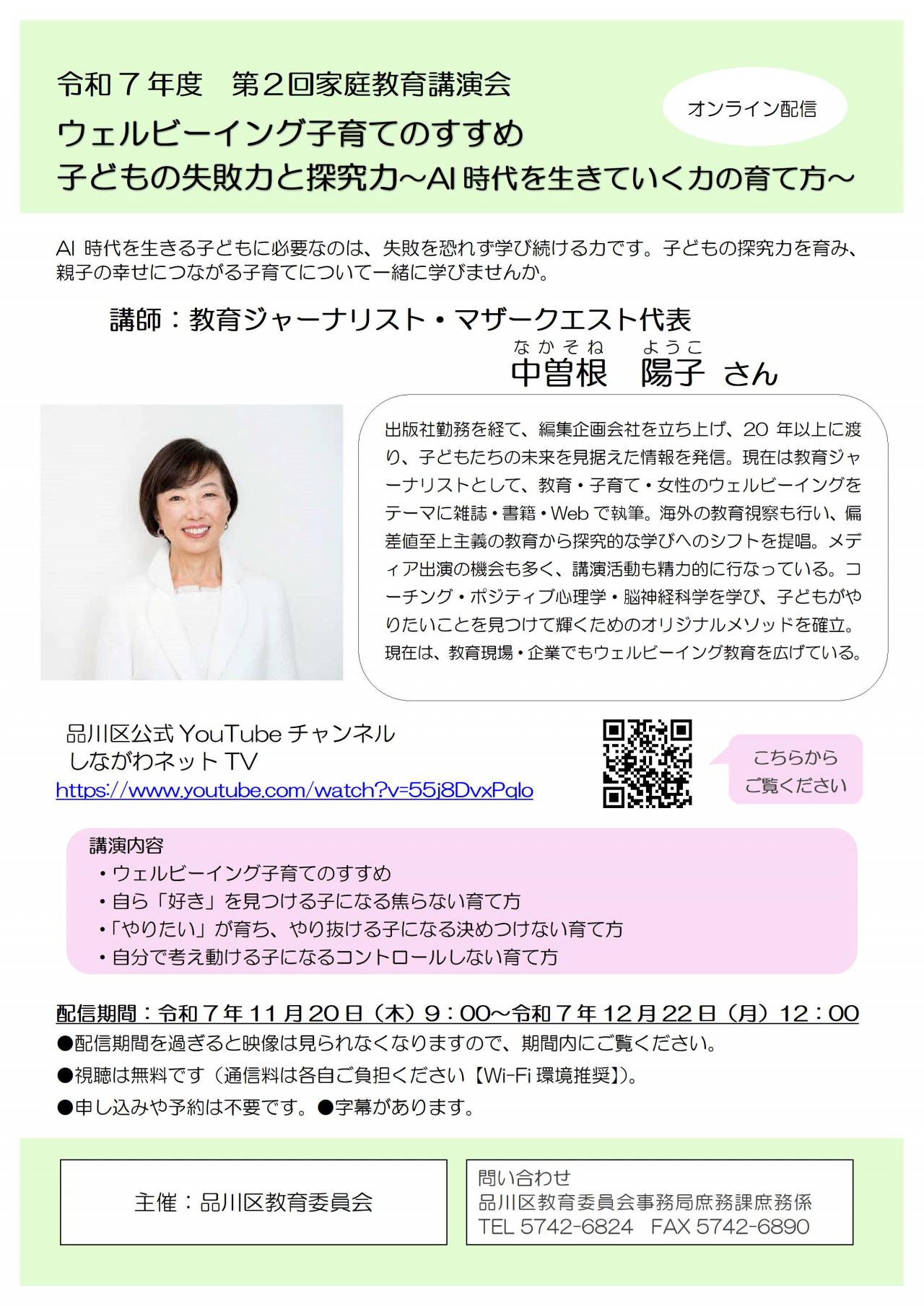 令和7年度第2回家庭教育講演会の動画を「品川区公式チャンネルしながわネットTV(YouTube)」にて公開しています。