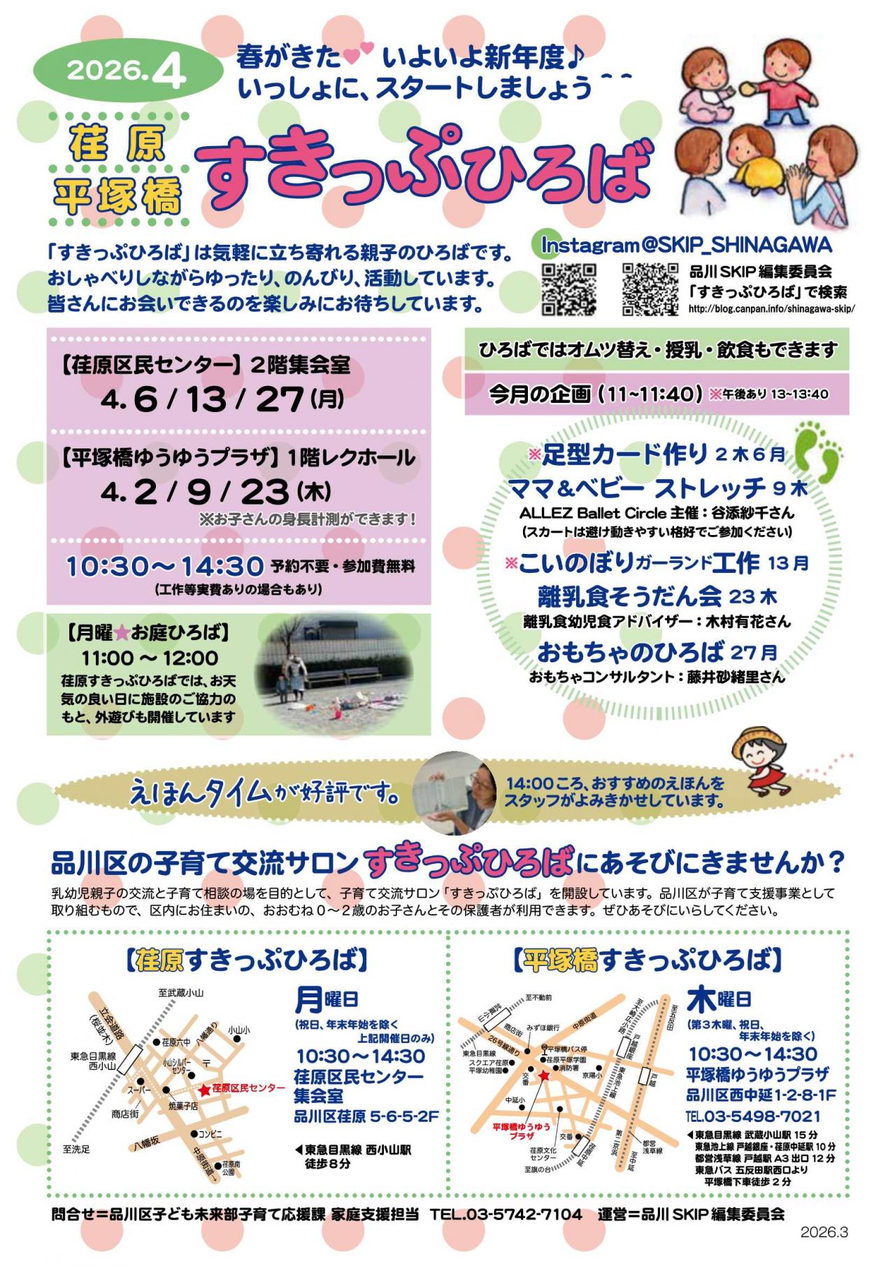 4月のすきっぷひろばでは、ママストレッチやこいのぼり工作や足型カード、離乳食講座などを企画しました。皆さんのお会いできるのを楽しみにしています。