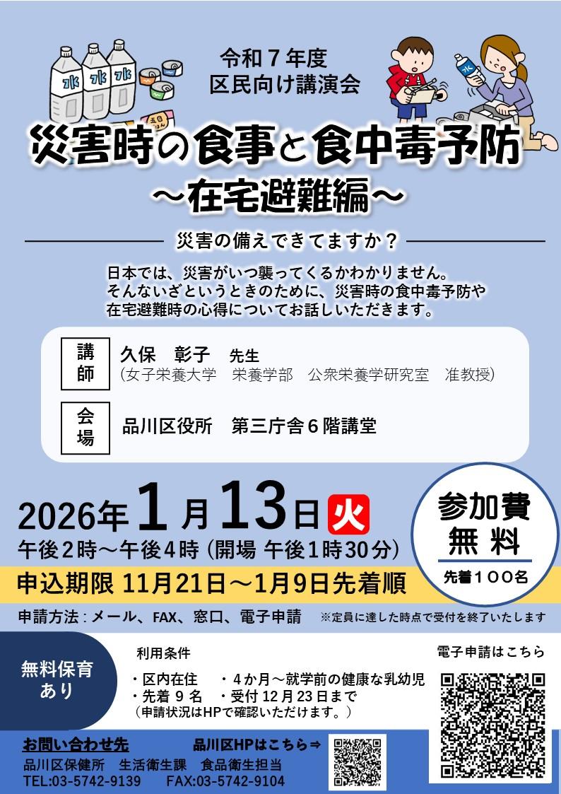 品川区保健所主催の区民向け講演会「災害時の食事と食中毒予防~在宅避難編~」を開催します。