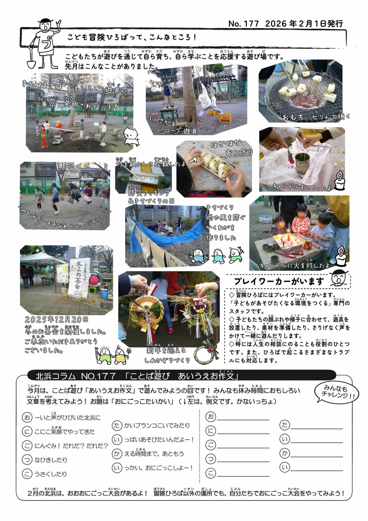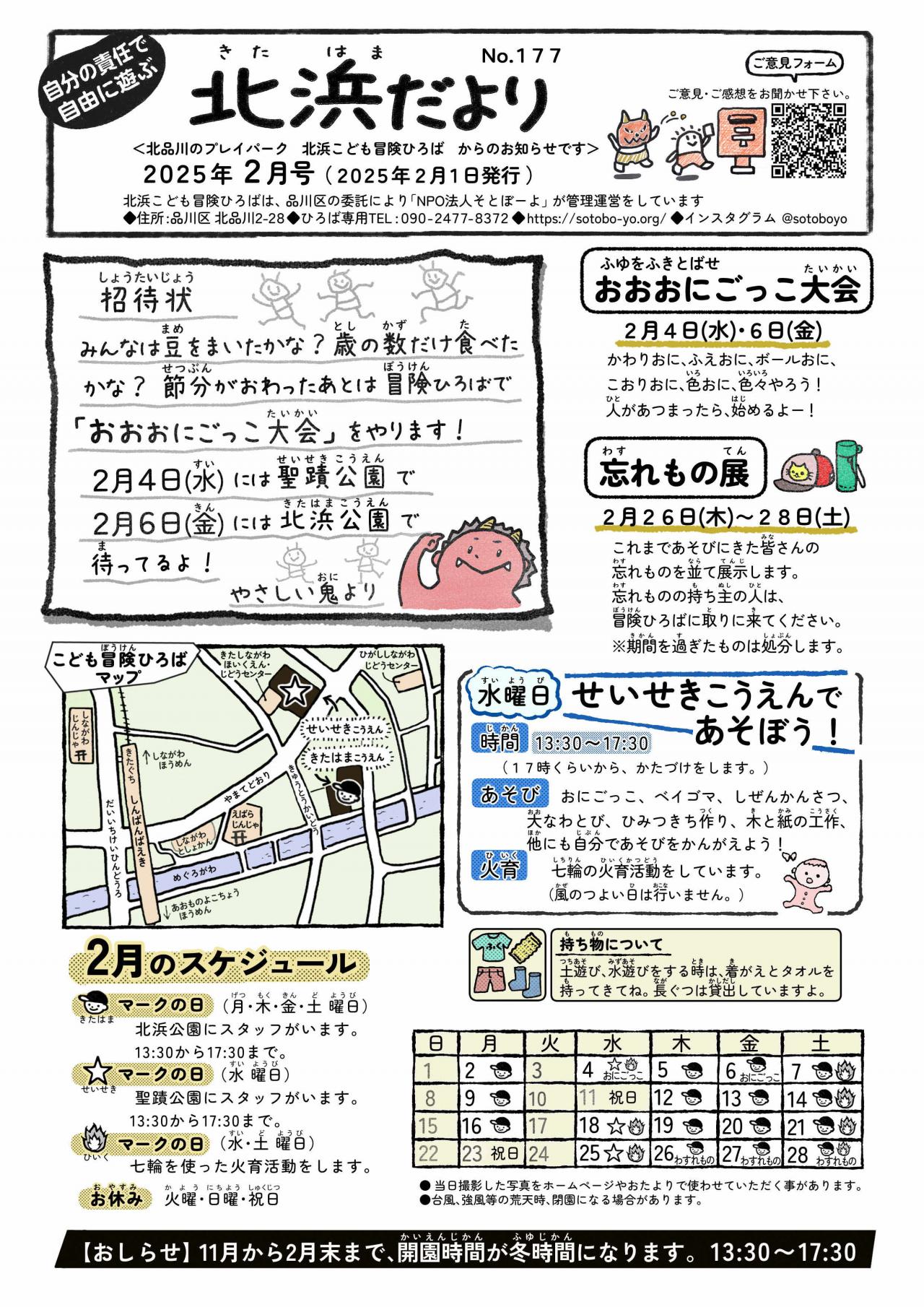 どろあそび、みずあそび、おちばあそびみぢかな しぜんにふれあいながら みんないっしょになって たのしもう。せいせきこうえん でも やっているよ。ばしょ きたはまこうえん せいせきこうえんようびとじかん(きたはまこうえん)げつ・もく・きん・ど ようびごご 2じ から ごご 6じ※11月~2月 ふゆじかん 5時30分まで(せいせきこうえん)すい ようびごご 2じ から ごご 6じ※11月~2月 ふゆじかん 5時30分まで