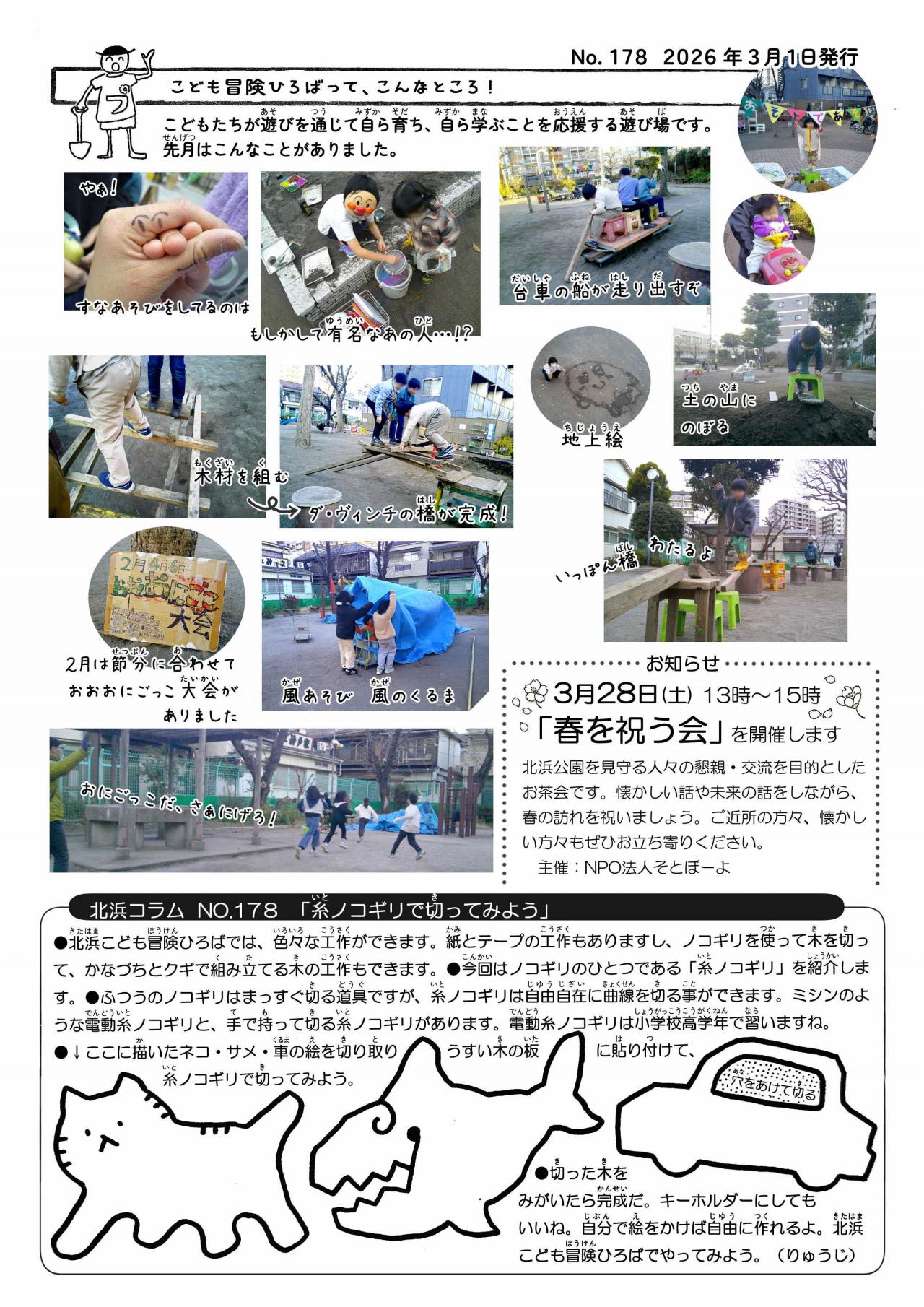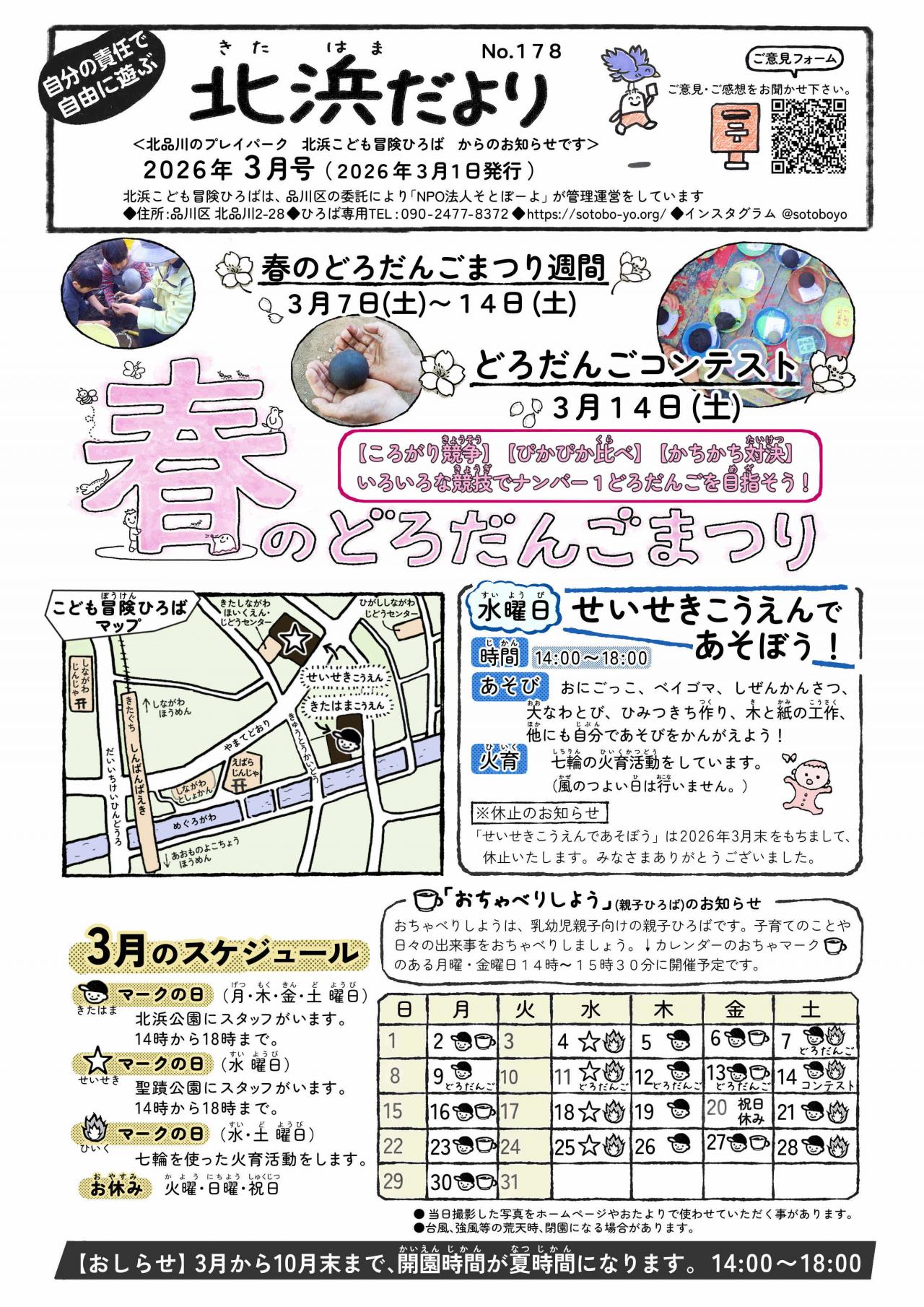 どろあそび、みずあそび、おちばあそびみぢかな しぜんにふれあいながら みんないっしょになって たのしもう。せいせきこうえん でも やっているよ。ばしょ きたはまこうえん せいせきこうえんようびとじかん(きたはまこうえん)げつ・もく・きん・ど ようびごご 2じ から ごご 6じ※11月~2月 ふゆじかん 5時30分まで(せいせきこうえん)すい ようびごご 2じ から ごご 6じ※11月~2月 ふゆじかん 5時30分まで