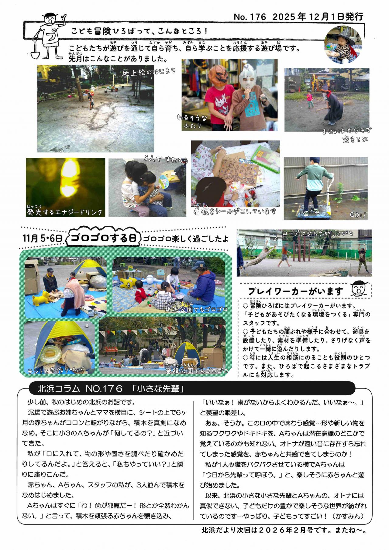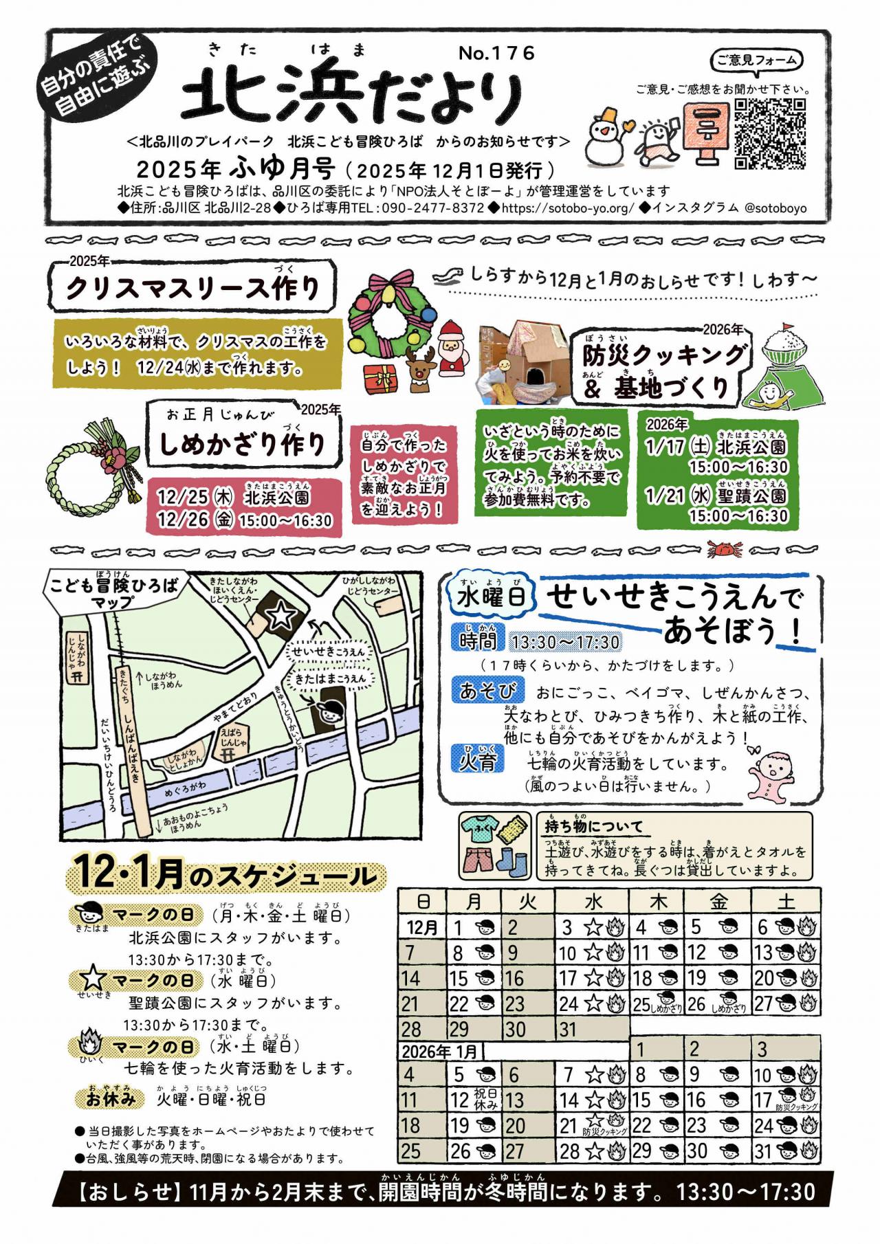 どろあそび、みずあそび、おちばあそびみぢかな しぜんにふれあいながら みんないっしょになって たのしもう。せいせきこうえん でも やっているよ。ばしょ きたはまこうえん せいせきこうえんようびとじかん(きたはまこうえん)げつ・もく・きん・ど ようびごご 2じ から ごご 6じ※11月~2月 ふゆじかん 5時30分まで(せいせきこうえん)すい ようびごご 2じ から ごご 6じ※11月~2月 ふゆじかん 5時30分まで